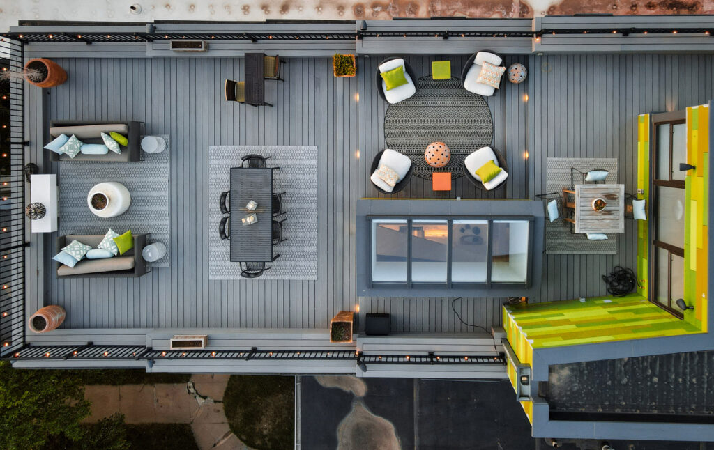 Follow a third set of stairs up to the rooftop terrace, which includes an enclosed food and beverage serving room. A composite floating deck with built-in lighting covers the entire terrace and offers the ultimate in scenic outdoor entertaining with a truly unique style and ambiance.