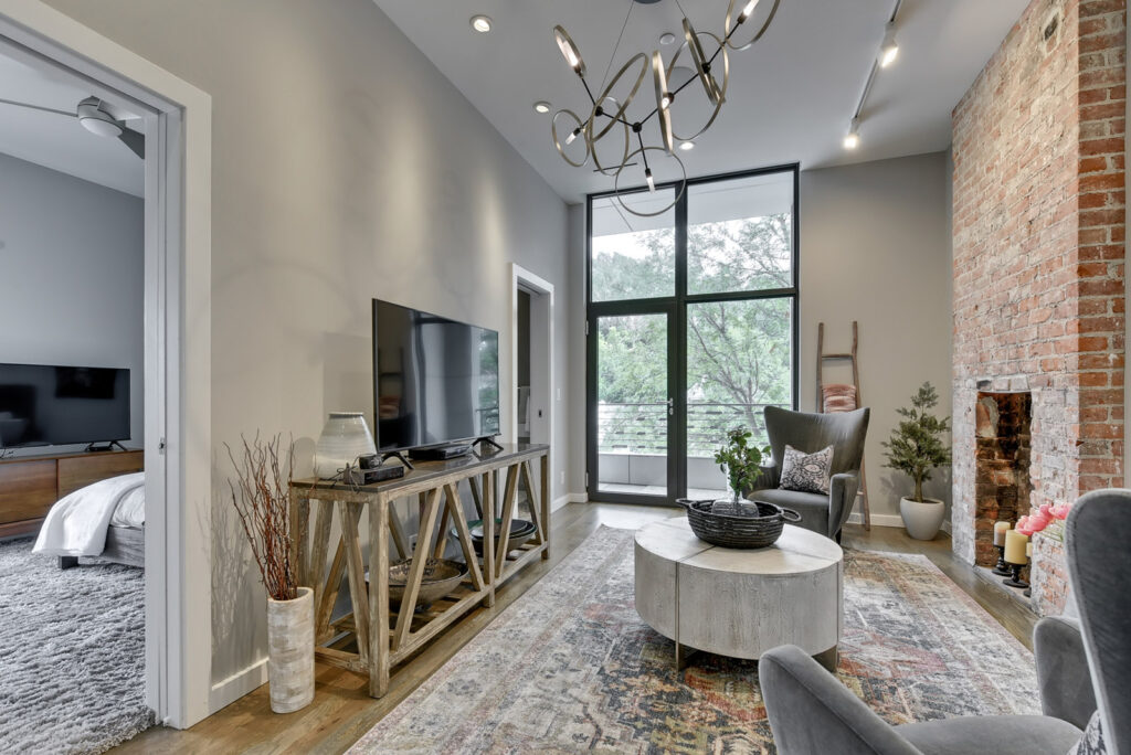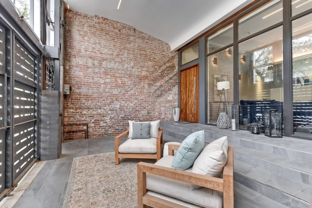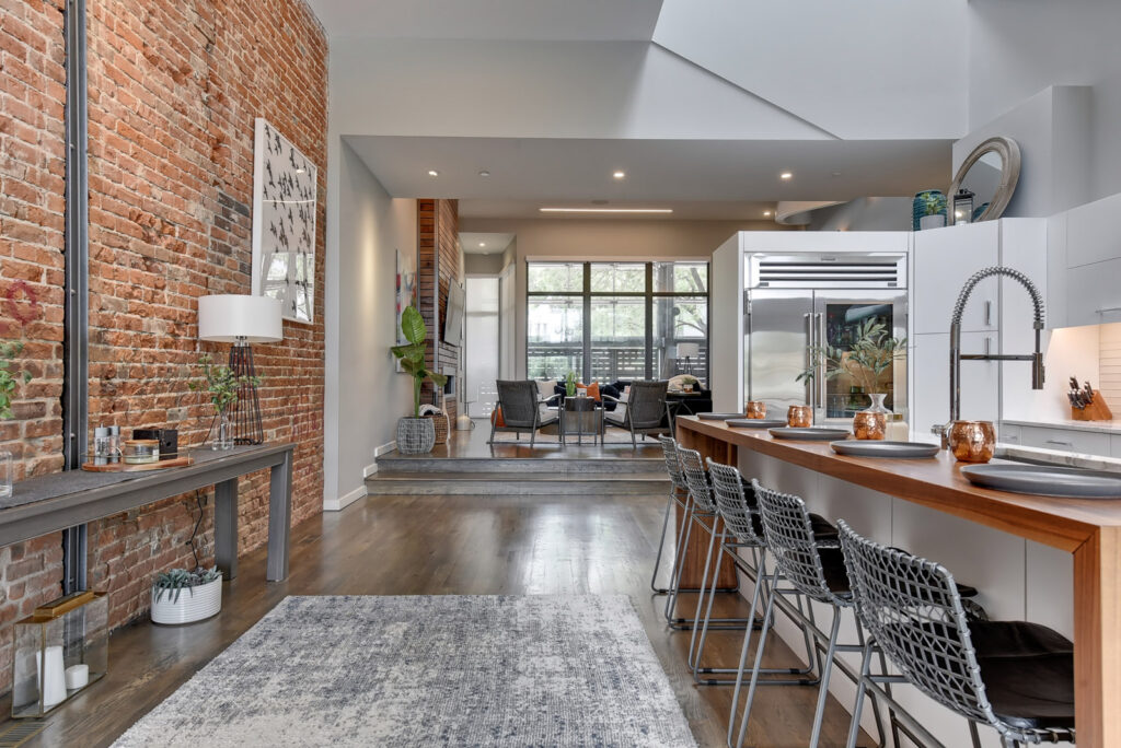 The home’s listing agent is Angela Turner, who is a Bjork Group team member with Berkshire Hathaway Home Services, which works with an array of buyers, including luxury listings. Turner said the home underwent a complete remodel two years ago, giving it a fresh, clean, contemporary look and feel while maintaining some of its original exposed brick walls inside. The home’s front porch sits behind several sets of windowed doors that open toward the street, allowing for either complete privacy or welcomed views of the neighborhood. Then the front door opens into the main living room with an open floor plan into the modern kitchen, complete with commercial grade stainless steel appliances.