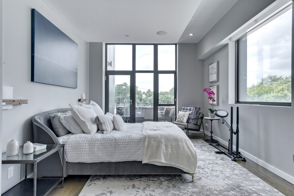 At the opposite end of the house is the master bedroom and bathroom, which also has its own large sitting area. The master bedroom includes another private balcony and its own washer/dryer. The master bath features a large walk-in shower, soaking tub, and walk-in closet with extra tall ceilings to allow for ample shelving—a necessity with urban living.