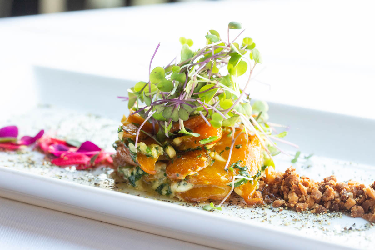 Main plates include a classic French beef tenderloin, well-seasoned and cooked to perfection, each bite like a warm hug in front of a roaring fire. The glistening salmon fillet is perched atop a crispy king crab and sweet corn croquette and highlighted by a classic lemon beurre blanc. Tournedos of beef are accompanied by a stunning Peruvian potato puree and more luscious king crab.