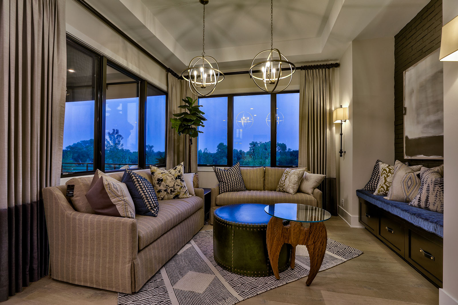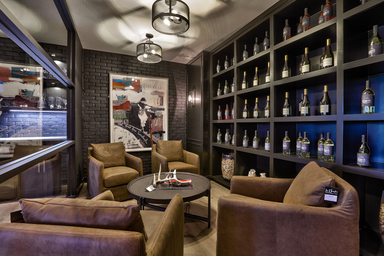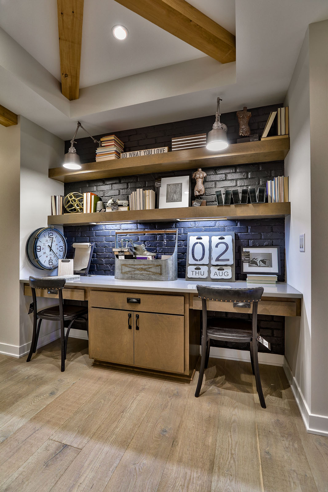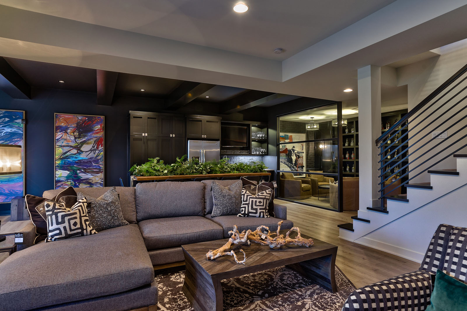 Other unique features are the concrete bio fuel vent-free fireplaces throughout the home, the floating staircase, and the custom wine cellar wall in basement. Falcone also puts an emphasis on using a mixture of finishes throughout the home, incorporating different metals and woods. This home has cedar beams across many ceilings, interior brick detail, custom iron front doors, and interior reclaimed barn wood doors. Rather than granite, all countertops are quartz, and it includes a commercial-grade glass divider wall in the basement, which isn’t often seen in a residential application.