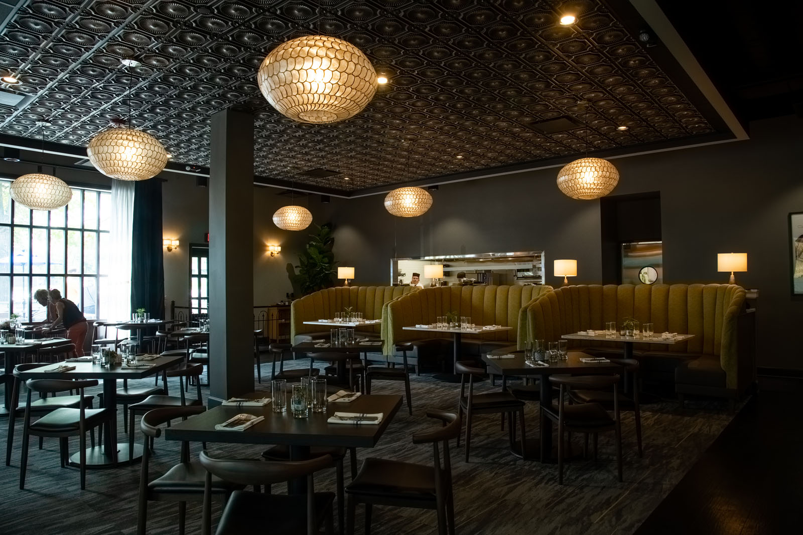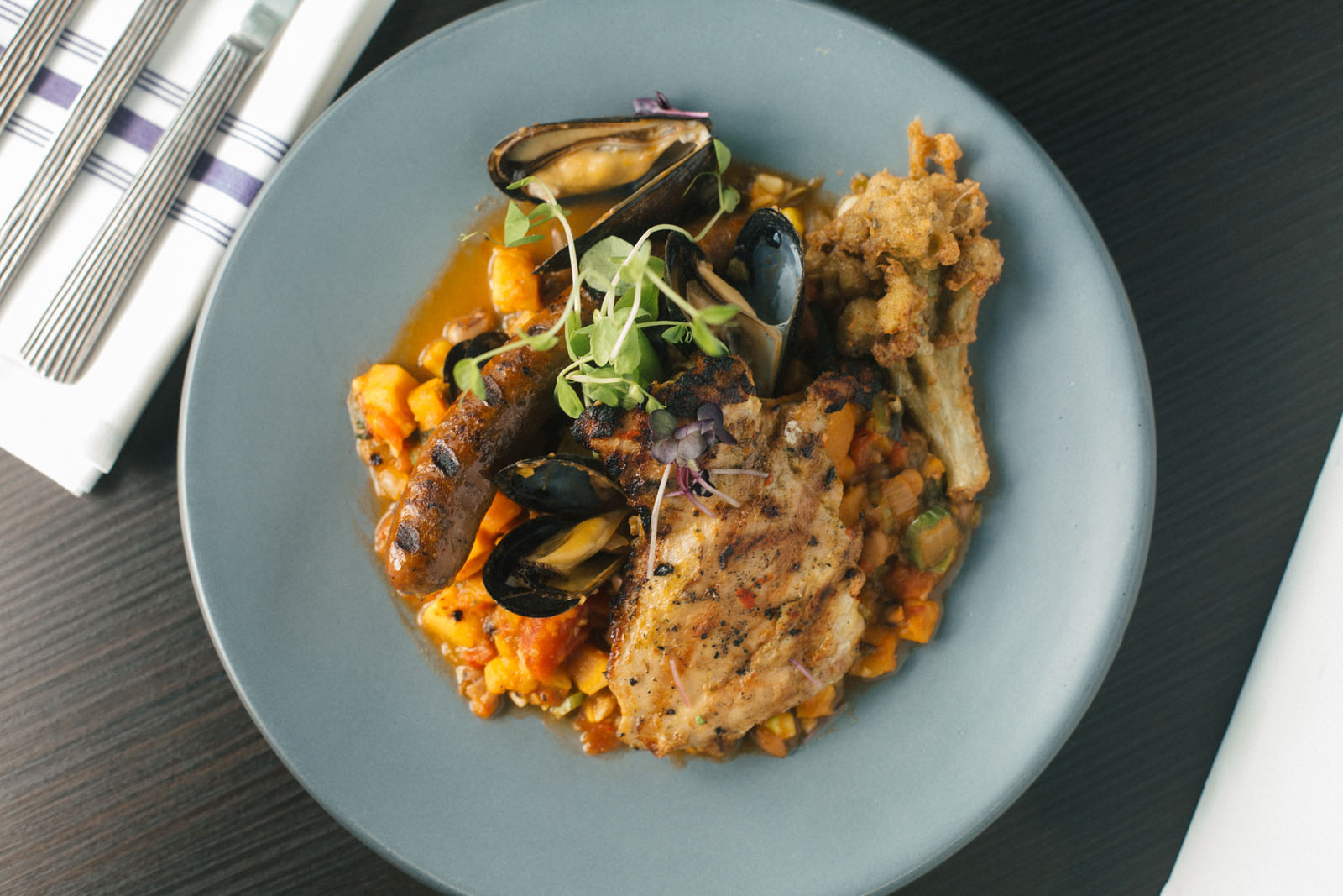 Located across from Garbo’s Hair Salon in Regency, Mode de Vie’s world-eclectic cuisine matches its décor. Designed by Ginger Meadows with GM Designs, the restaurant’s warm mustard-yellow and deep French blue color palate provide a comfortable, inviting setting for both casual and more formal diners. “We wanted it to be Great Gatsby meets mid-century, with a French country feel in both the décor and the food,” Meadows said. She incorporated elements from all of the French cultures represented, such as grass-shade light fixtures, a Mediterranean bar front, and mosaic ceiling tiles.