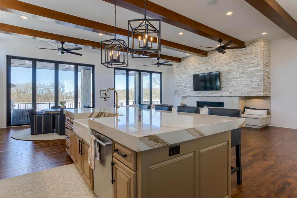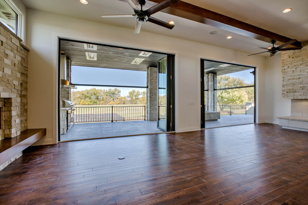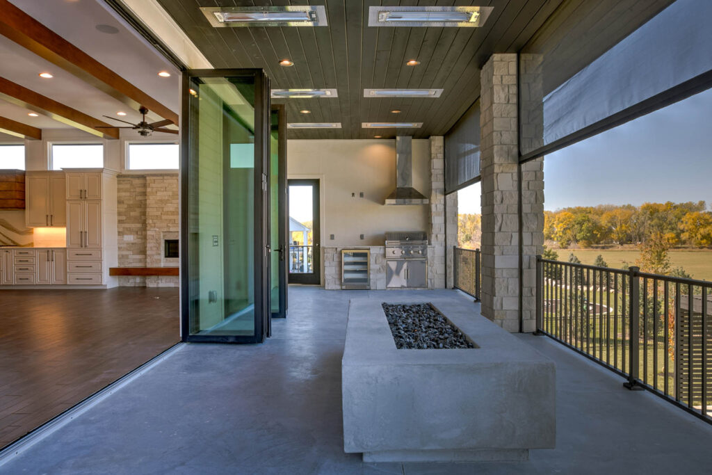 Bringing the outdoors into the home was also a very important component for the Southwells. The kitchen and great room area, which spans over 960 sq. ft. and includes a deluxe high-end kitchen with Thermador appliances, custom cabinetry, two fireplaces, and 12-foot ceilings, also features 24 feet of panoramic opening doors that lead to an incredible outdoor concrete deck.