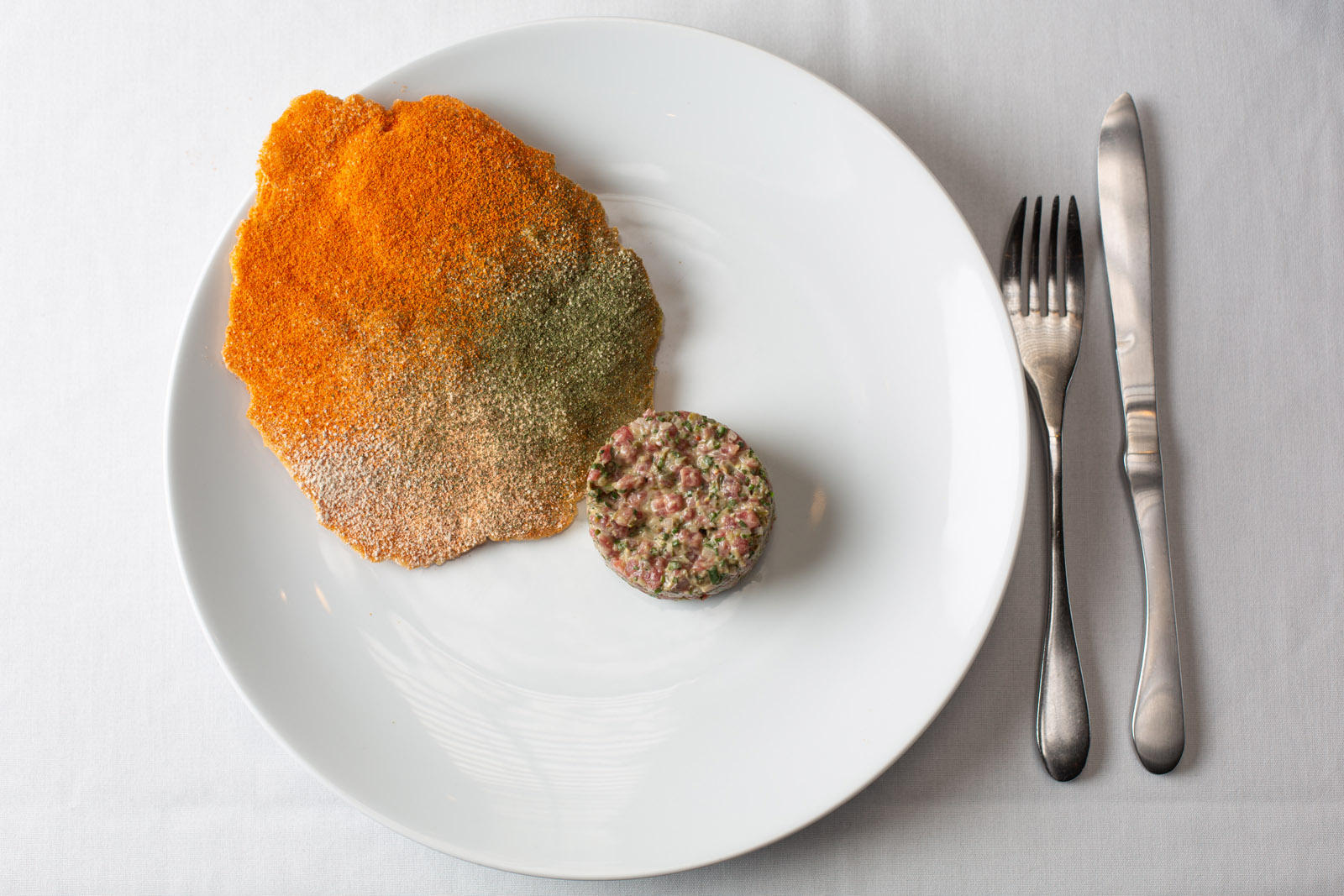 Local proteins, including Morgan Ranch Wagyu beef from Burwell, Nebraska, are always featured, including the 8-ounce strip used in the popular pepper steak. Steak au poivre (steak with peppercorn sauce) is nearly always on the menu, and on this day featured bone marrow emulsion and broccolini, nestled near écrasée de pommes and smoked butter. “The beef remains constant, but the sides change seasonally,” explained Newton.