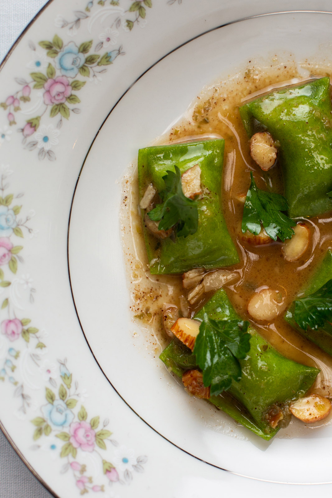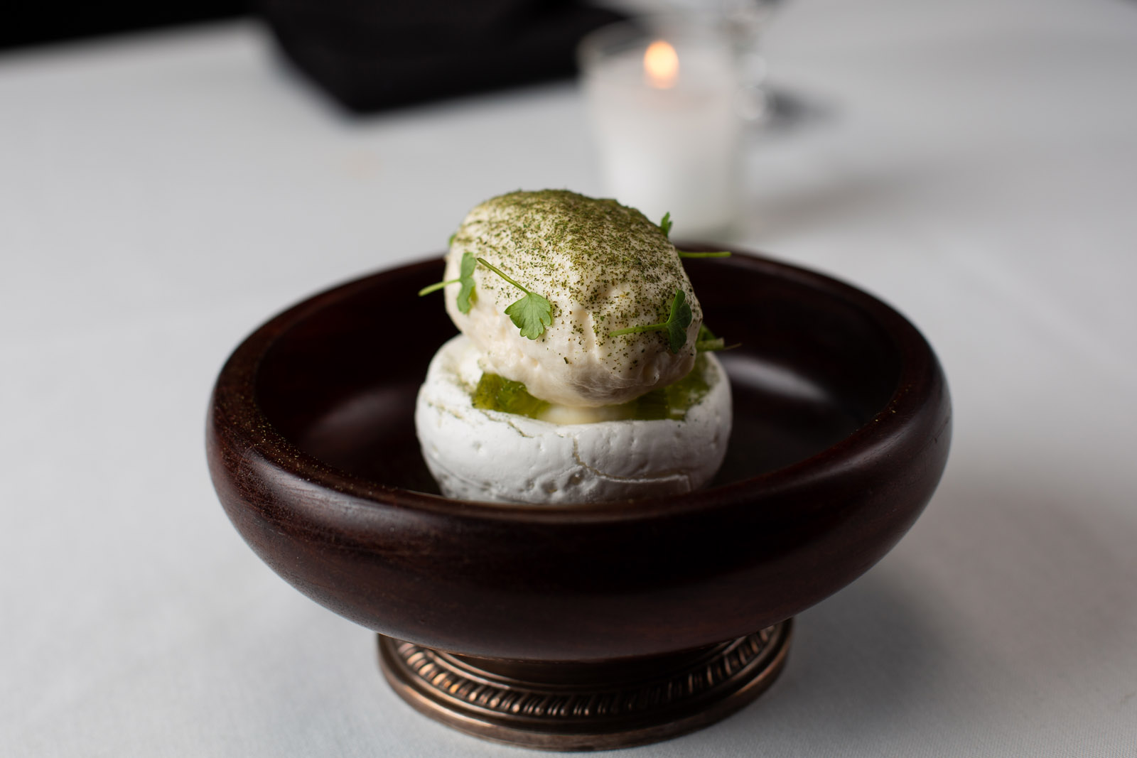 Pastry Chef Ally Peralta brings a joyful creativity to the kitchen, experimenting with unique flavor combinations grounded in solid French technique. Featured on the dessert menu this winter was an elderflower pavlova served with yogurt, quince foam, and candied celery.