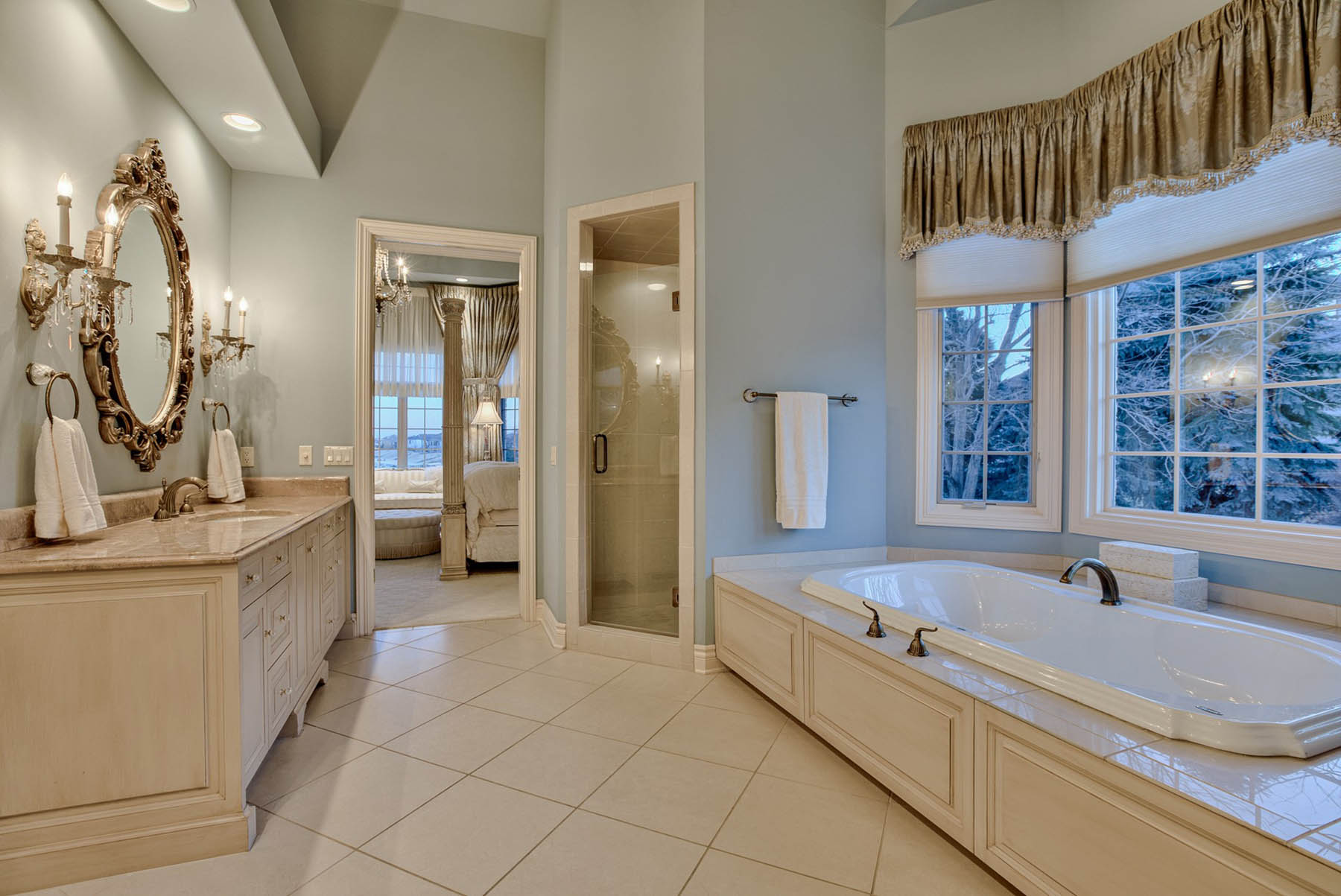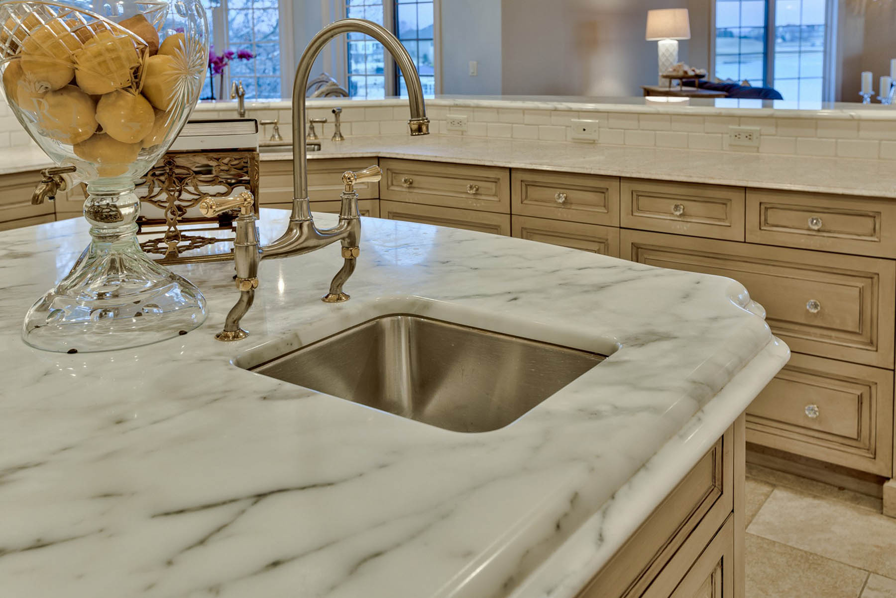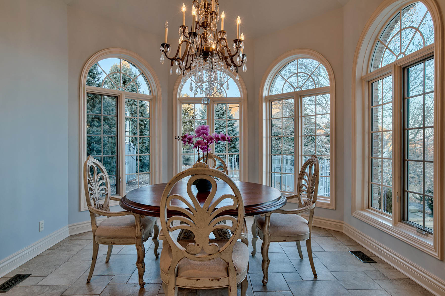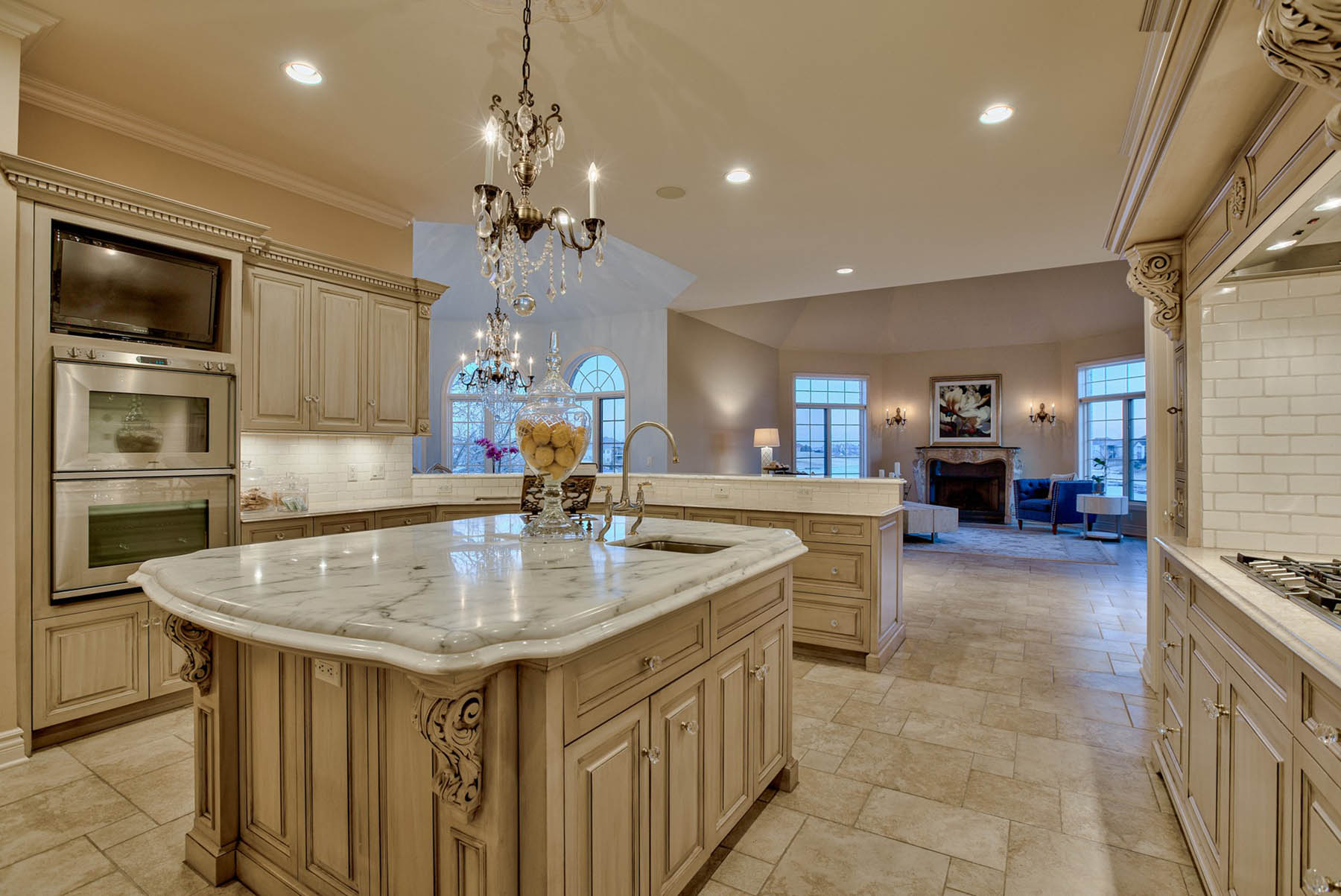 Beautifully carved marble countertops and high-end appliances fill the chef’s kitchen, and a formal dining space summons guests to feast while they take in a floor-to-ceiling window view of the front courtyard. A dreamy octagonal breakfast room sits just off the kitchen, and a spacious living room with a wet bar awaits, ready to accommodate the next gathering.