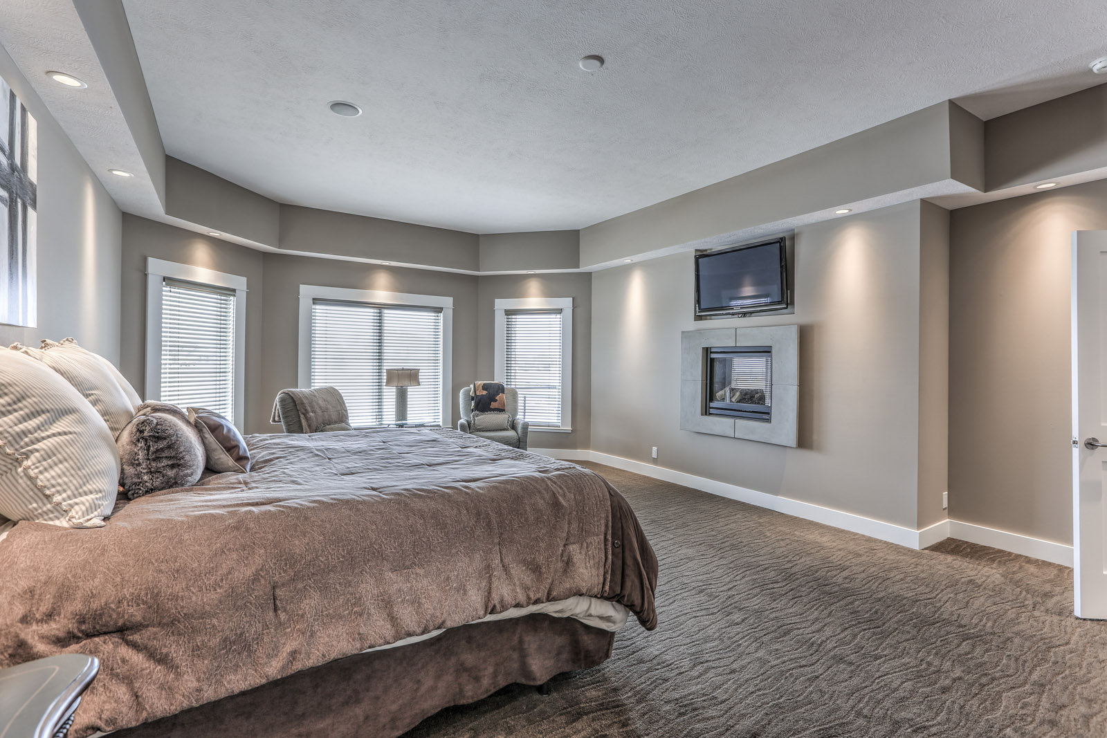 Inside the master suite, a picturesque view of the lake, paired with an oversized master bath, deems the space an elegant and comfortable haven. Furnished with a freestanding tub, large steam shower with multiple shower heads, three sinks, and a large closet, this master bath provides both