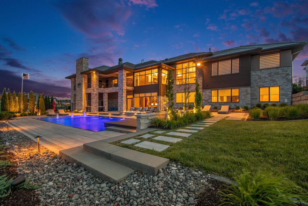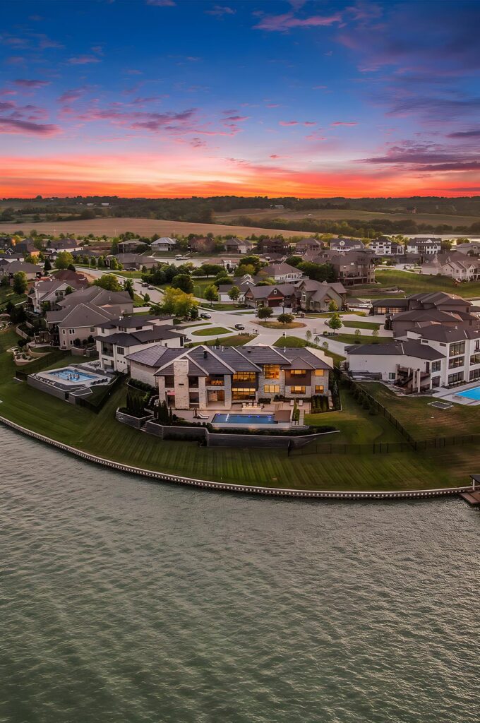 The home’s knife-edge pool with fountains, heated outdoor dining and living area, and lakefront views offer a relaxing spot for hosting large gatherings. “Sometimes you forget you are in Nebraska because the views with the boats going by are so stunning,” Susie Devney said.