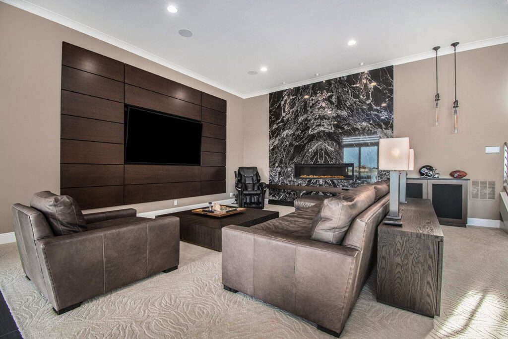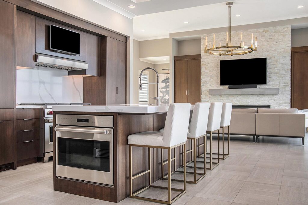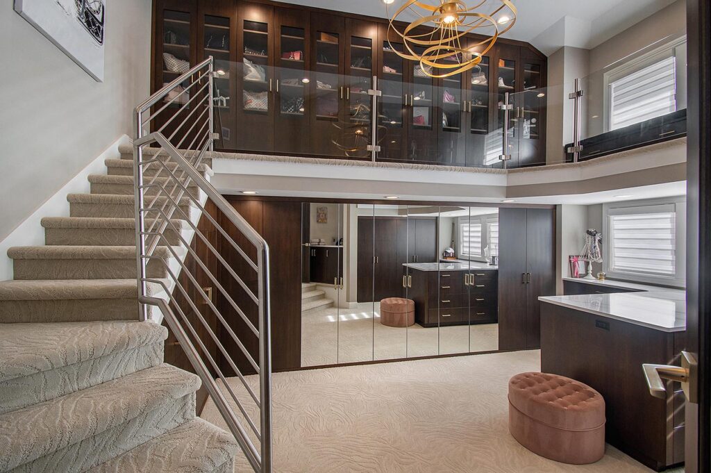 Much to her delight, the home’s luxurious primary bedroom suite features a two-story closet that is perfect for tucking away a collection of clothes, handbags, shoes, and more. An avid baker, Devney also enjoys the baking center in the dining area that she so lovingly crafted. Jim Devney, on the other hand, is fond of the spacious six-car garage and the home’s lower level that was intentionally designed for unwinding. The space features a large living area, bar, exercise room, finished safe room, and additional bedrooms with private ensuites. The backyard is another favorite element for Jim Devney, as he sketched the plan for the space with the help of Mulhall’s.