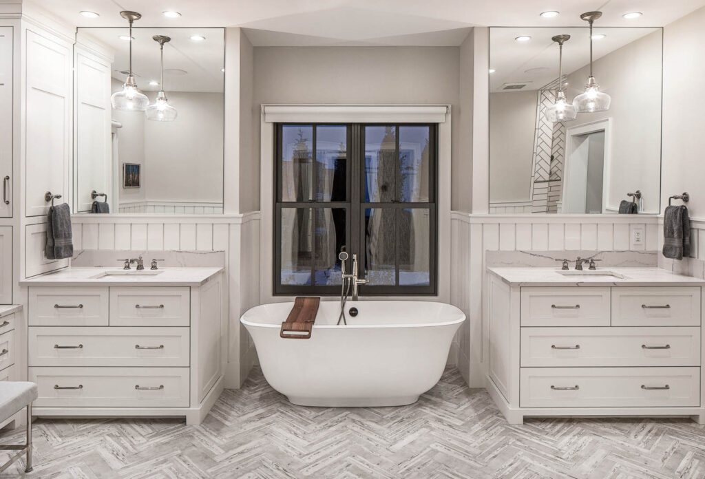 An early inspiration of a modern farmhouse, the home is also layered with architectural millwork details that elevate the design’s sophistication. During the design process, our clients often laughed that, “Well…maybe we need more shiplap!” At times sarcastic, but then, why not? This architectural element truly gives this home, with its abundance of pure white color tones, such charm; elevating spaces that would typically be clad in color but lacking in warmth and personality.