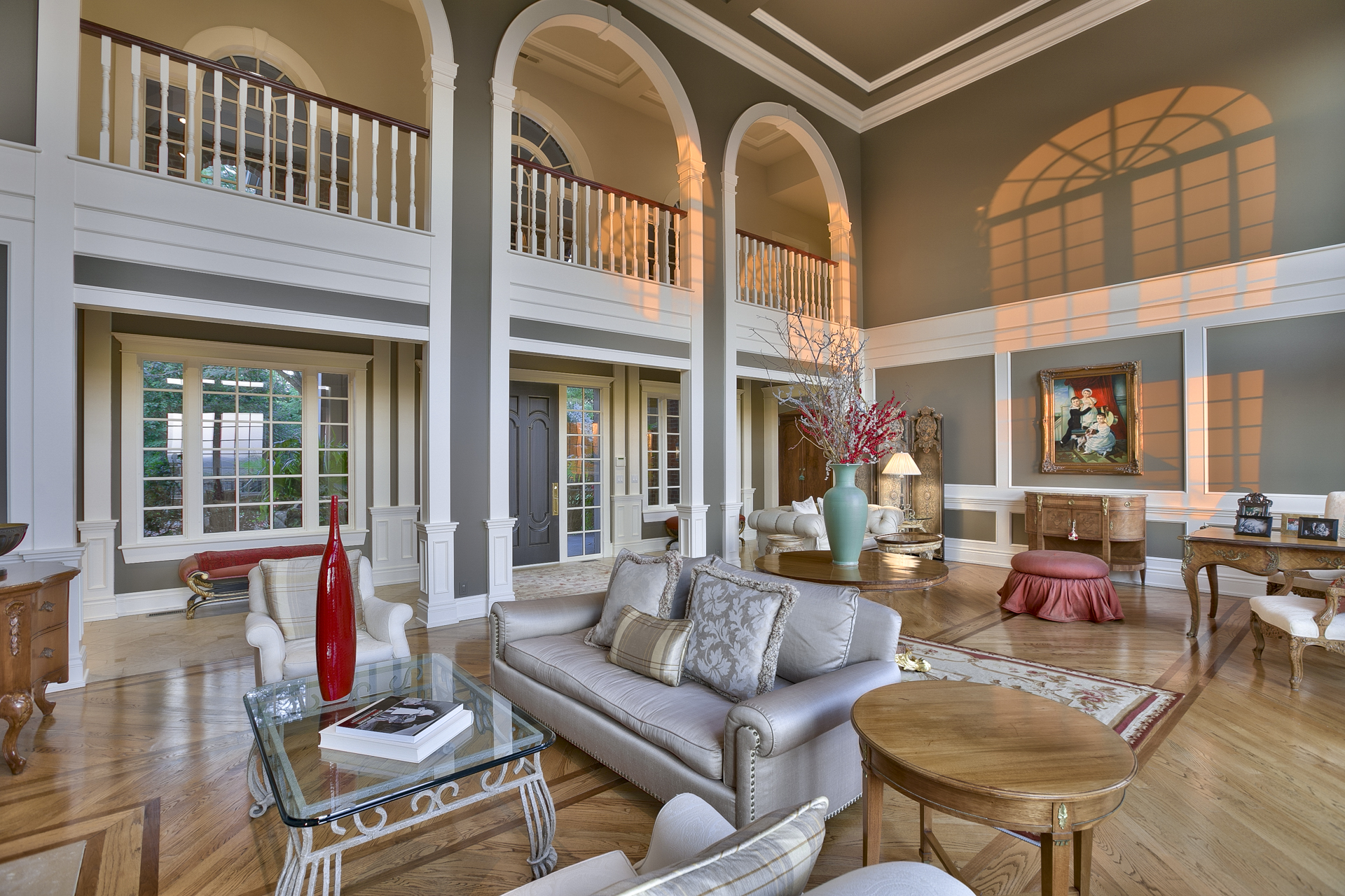 The entry way opens up into a grand living room with 20 ft. ceilings, windows, and double doors that open onto a sweeping patio that looks onto the priceless view. In fact, the homeowners often had live music playing on the patio while guests mingled both indoors and out, flowing into the lower level with its full bar and walk-out access to another covered patio and entertainment area.