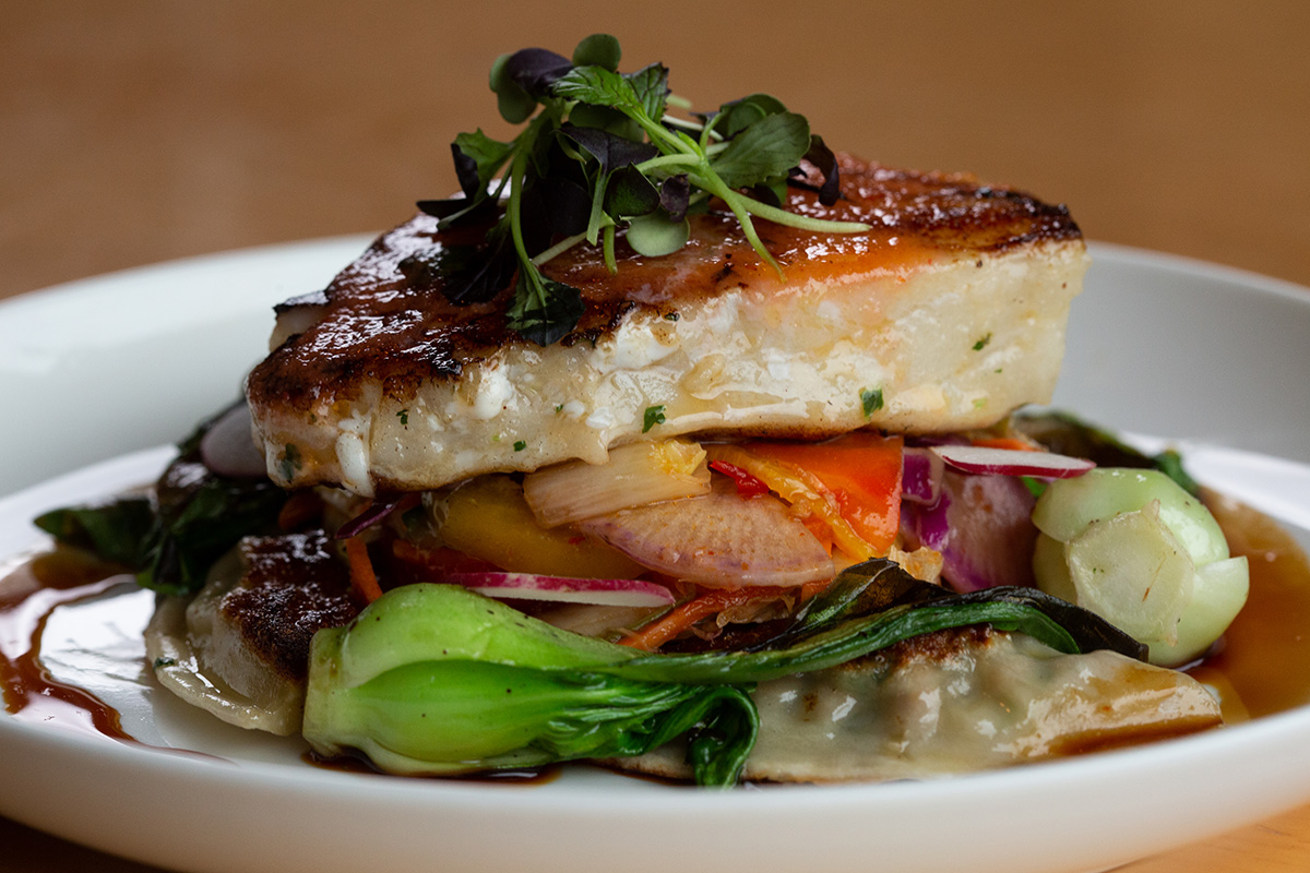 Another offering, the Seabass, presents an Asian flavor profile that features sake-marinated seabass served with crisp-tender marinated vegetables mingling with crispy vegetable pot stickers, drizzled with a tangy ginger vinaigrette, and dotted with a rich soy glaze.