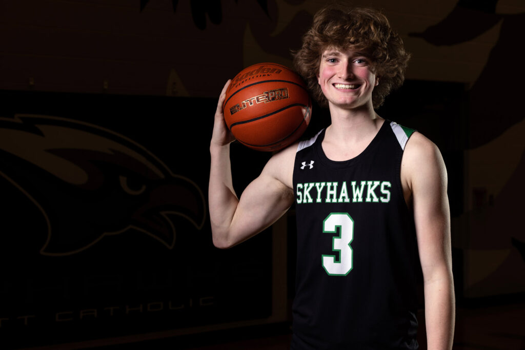 Skutt Catholic High School senior JJ Ferrin has had a ball in his hand ever since he could walk. Even his first word was “ball.” He’s been playing basketball on an Amateur Athletic Union (AAU) select team since third grade (playing in a fourth-grade league). “Summer, winter, and spring was always basketball,” he said. “Our family vacations in the summer were always for basketball tournaments with my select teams. I’ve been on travel and select teams all my life. I have had some of my best life experiences because of basketball.”