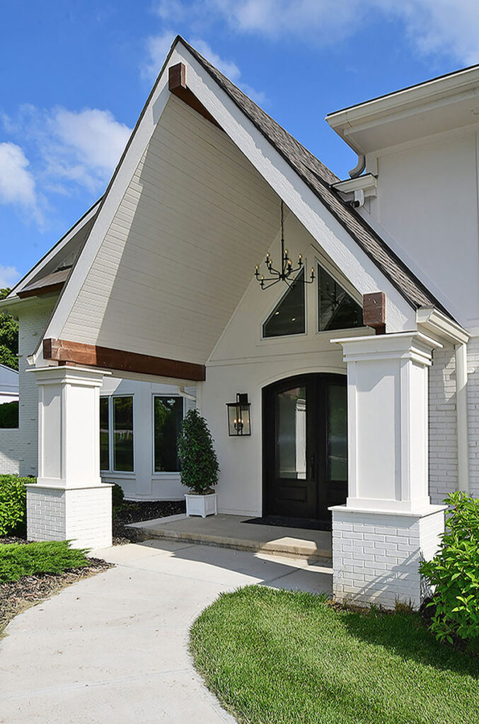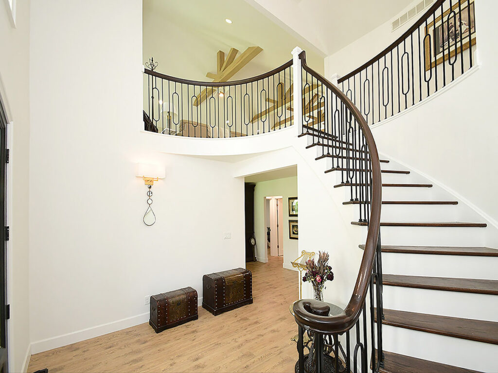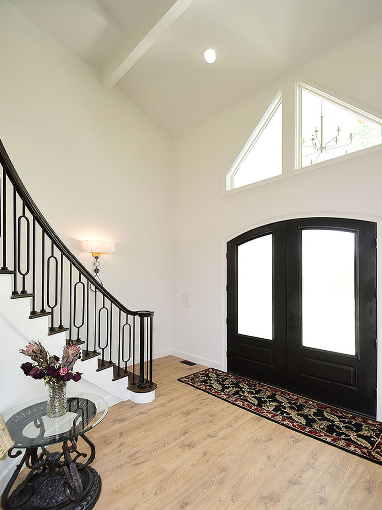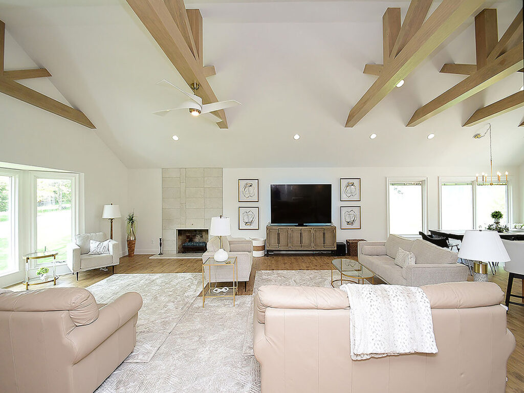 “Skyline Ranches is known for its extra-large lots with room for sport courts or outside activity structures,” said Van Deeb with Prime Home Realty. “And this is one of only five properties that backs up directly to the trail system.” From the outside, the home nods to classic Americana: pitched roofs, wood accents, and painted brick. Inside, it’s refreshingly modern. The great room spans more than 30 feet, anchored by oversized windows that frame uninterrupted views of the acreage. Beams cross overhead in a geometric rhythm, adding structure to the sky-high ceiling.