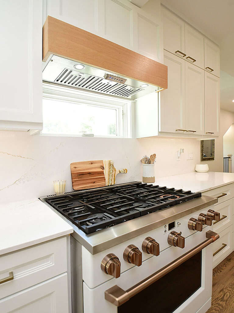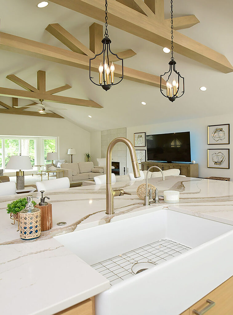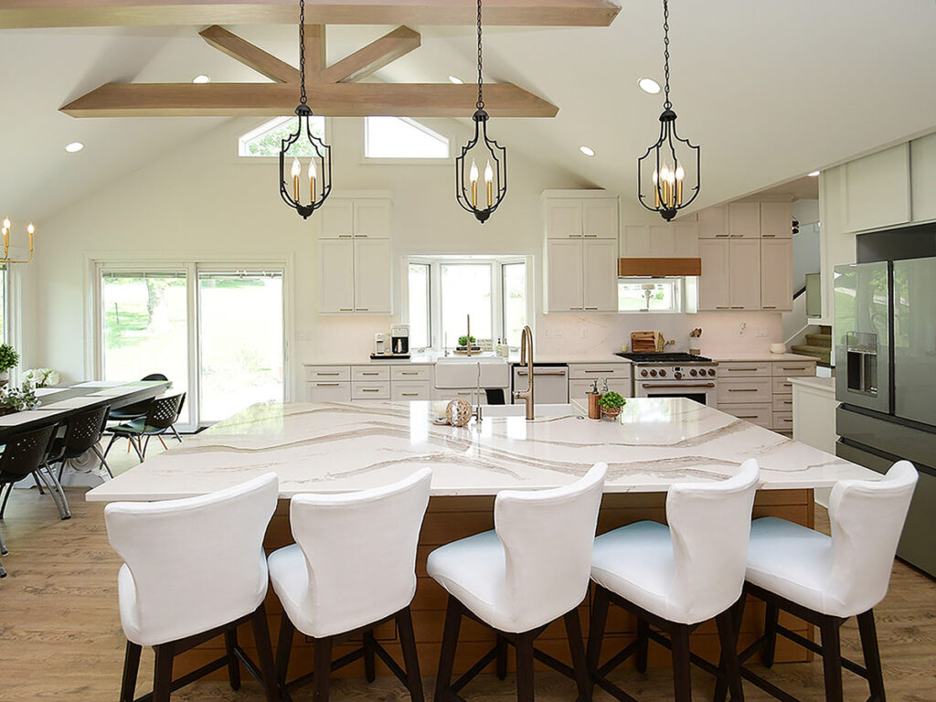 The kitchen is the heart of it all, outfitted with high-end GE Café appliances and anchored by a waterfall island that invites conversation. A farmhouse sink, pendant lighting, and custom cabinetry offer both function and polish.