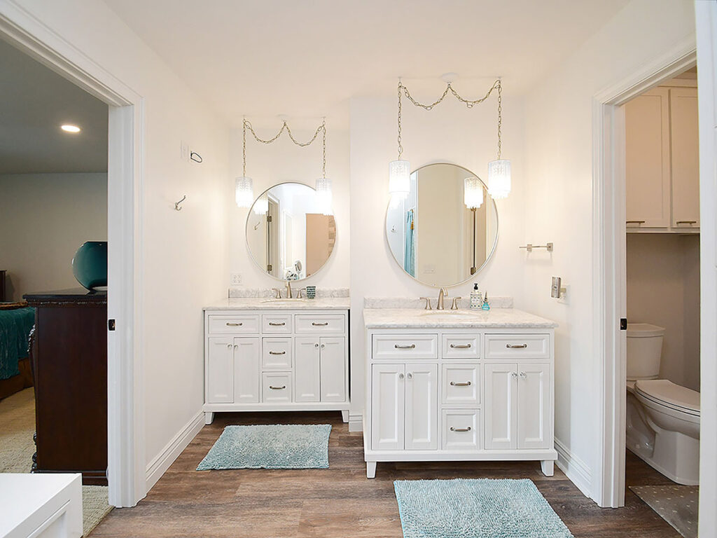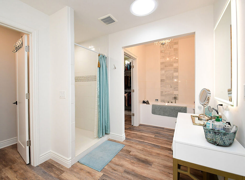 The primary suite serves as a sanctuary. Located on the main level, it includes dual walk-in closets, a spa bath with whirlpool tub and double vanities, and its own laundry. It’s connected to the rhythm of the home but offers the privacy needed to rest and recharge.
