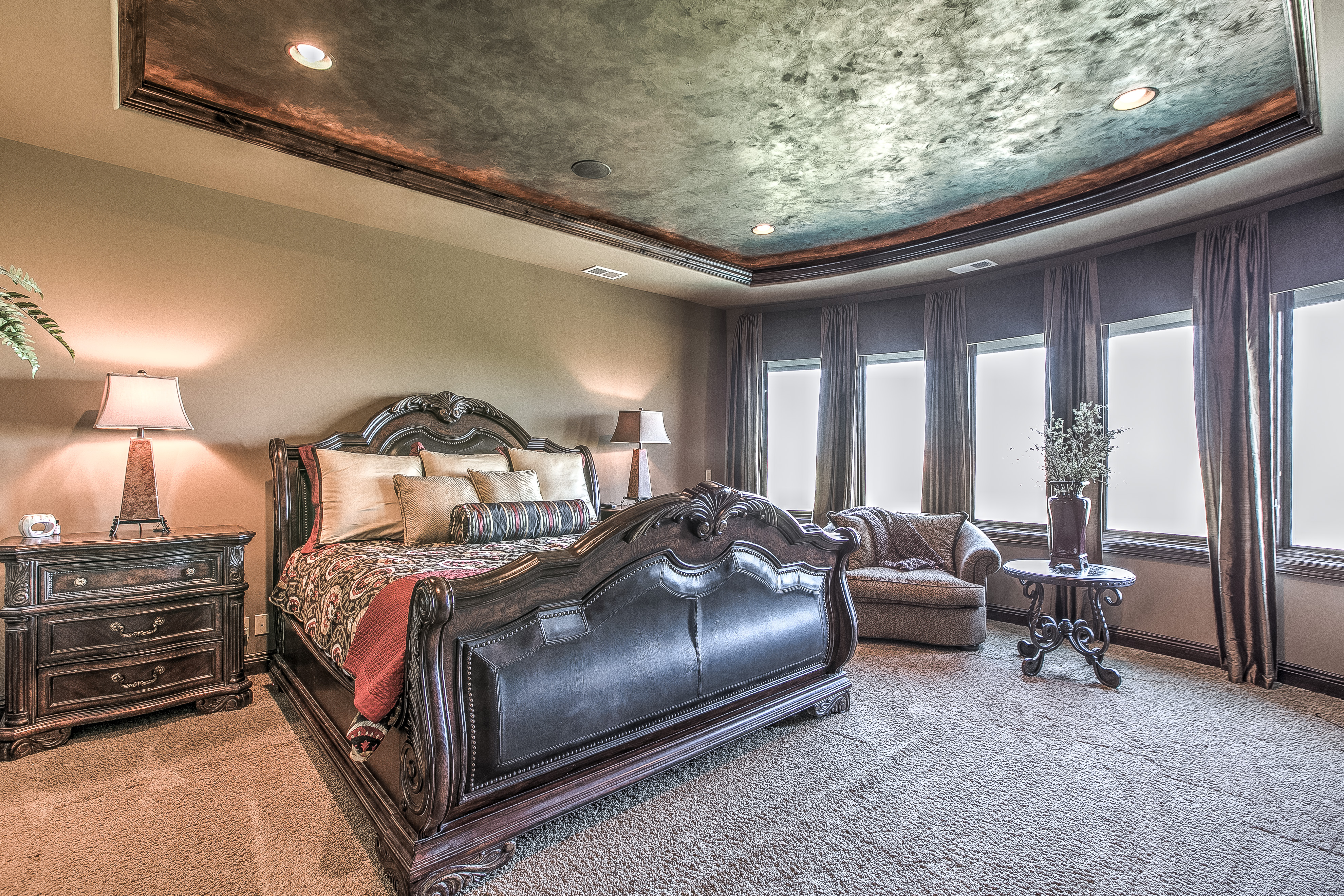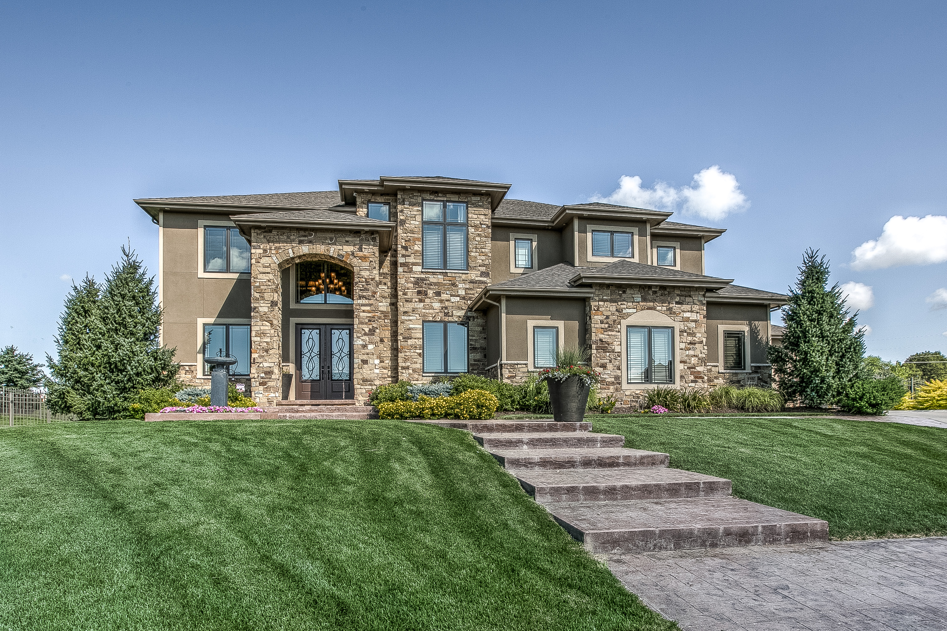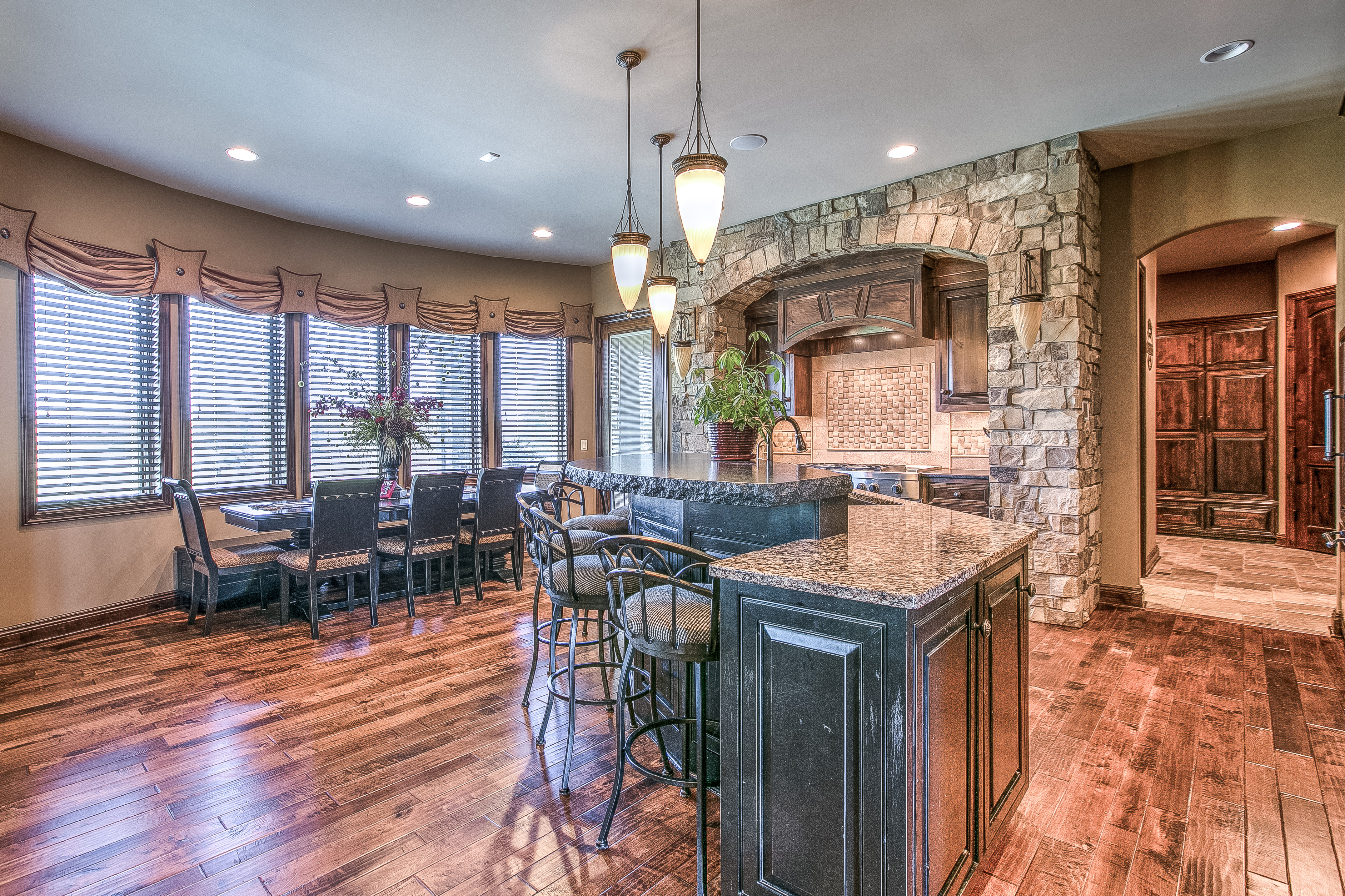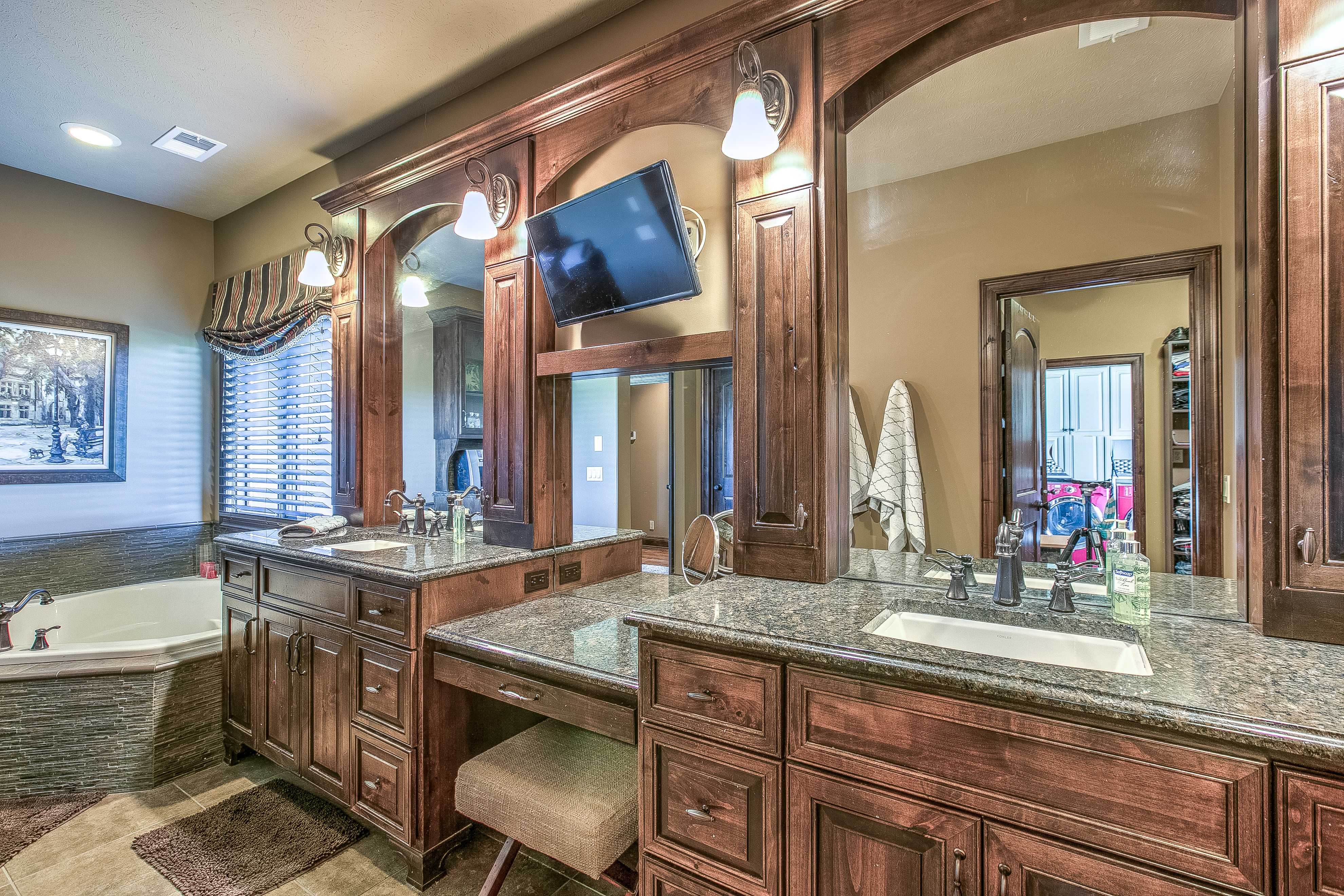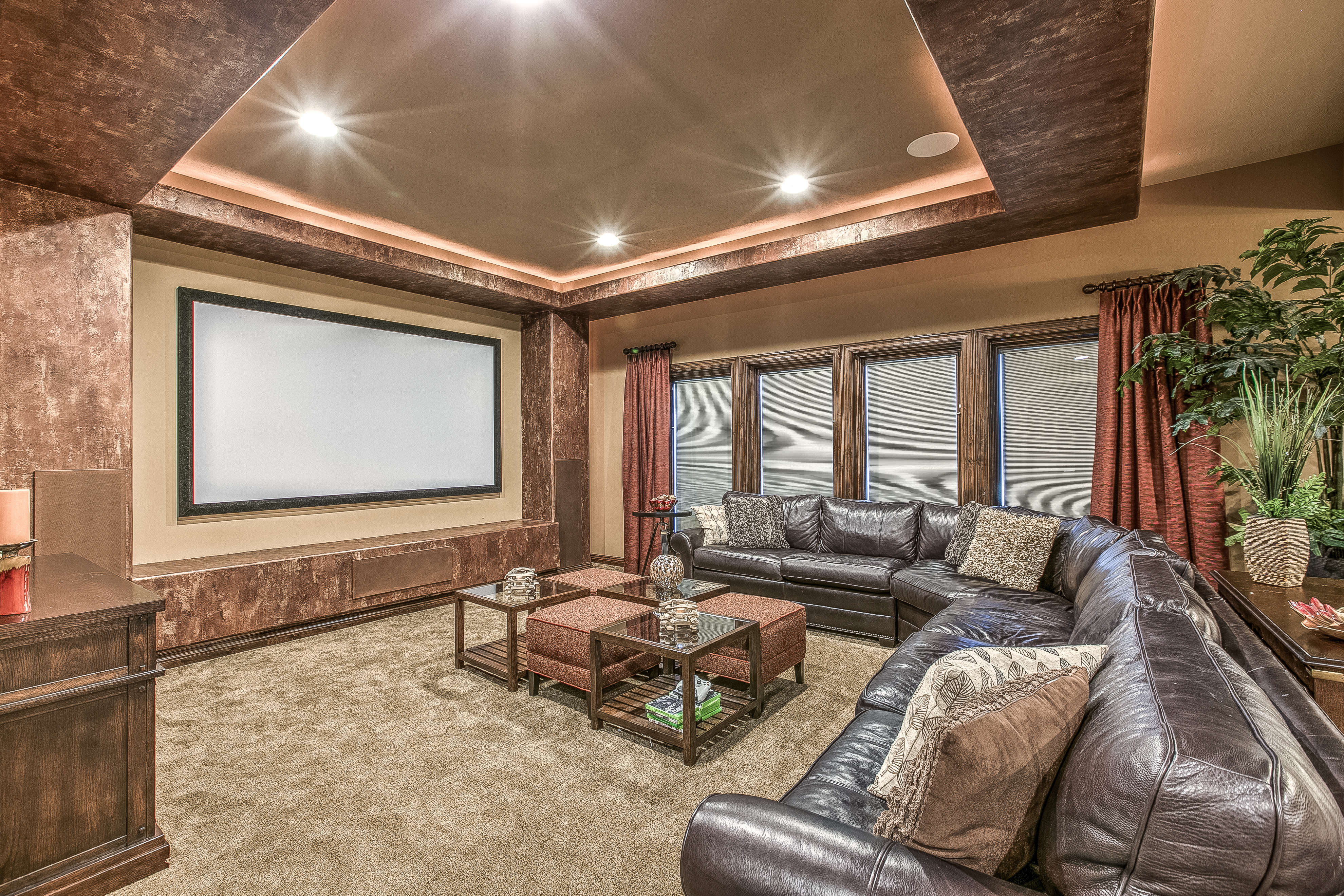 The master suite includes heated bathroom floors and black-out shades for the large windows, as well as a direct water line to the coffee station—another must-have at Rebecca’s request. The walk-in master closet opens to the laundry room, which was built to house two sets of washers and dryers—a necessity for three boys who are all involved in wrestling. Other family-friendly features include the lower level home theater with large built-in bar. The bar’s unique top is river stones encased in glass. There’s also a true fifth bedroom and two large storage rooms, one with an indoor sauna.