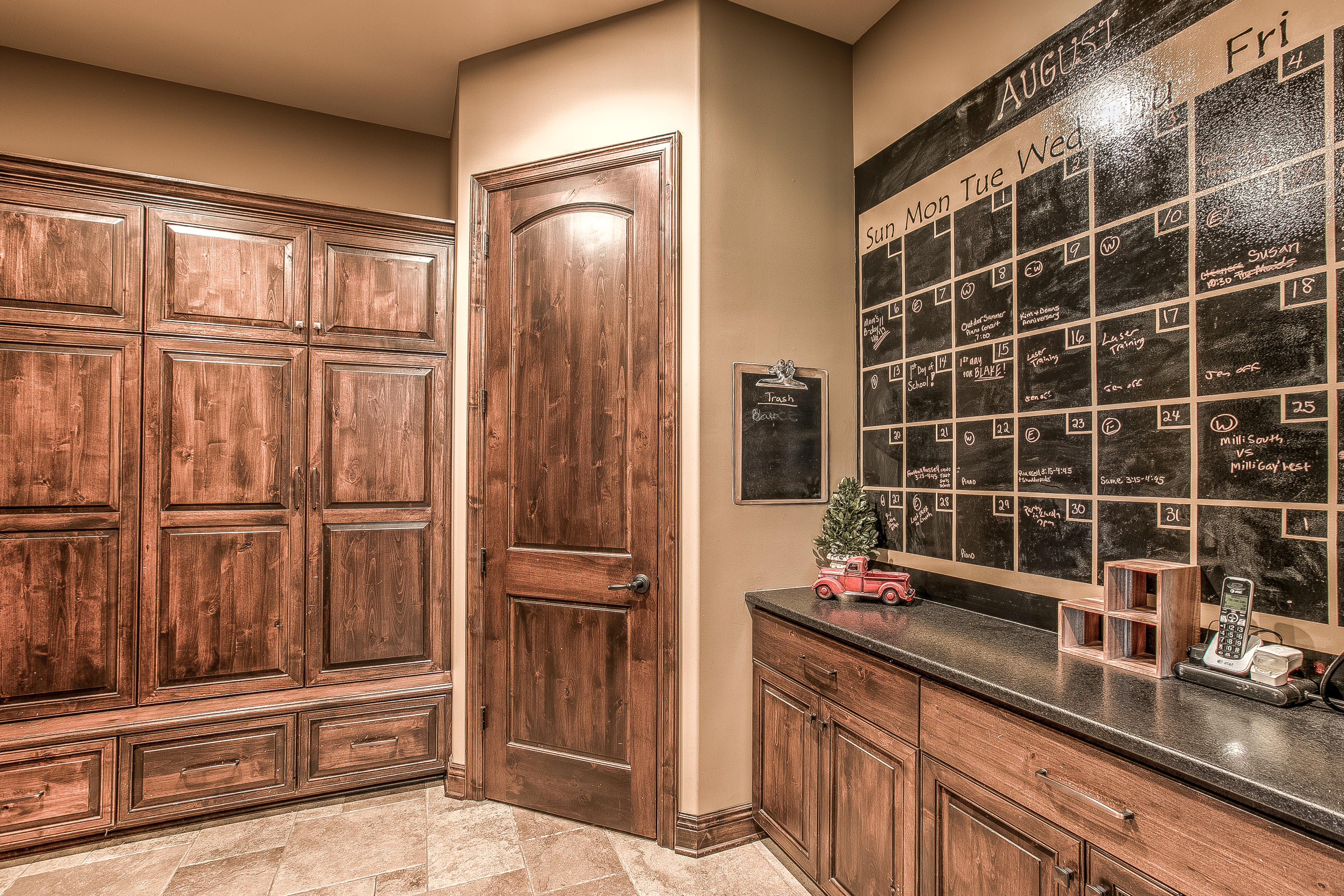 As a former teacher, family organization was imperative for Rebecca. As a result, a wall-size dry-erase master calendar was incorporated into the oversized mud room. “It’s the life center of the house and has been one of the best things we’ve ever done,” she said. There’s also a study/play room for the kids, with a large desk and three work stations. The lower level wrestling room can double as a gym, and a filtered water drinking fountain sits by the pool entrance for when the kids and their friends come inside.
