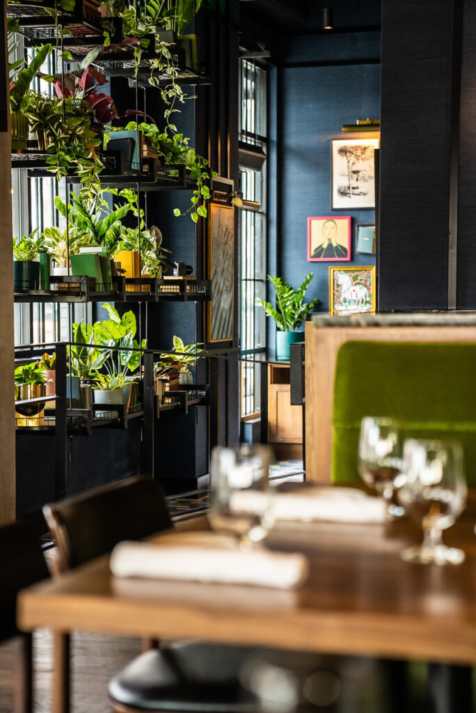 The dining room is imbued with a sense of nostalgia and comfort, with book nooks lining the walls and warm jewel tones adorning the furnishings. Tantalizing aromas permeate the senses as diners emerge from the busy street, shoulders immediately dropping as they begin to unwind. No detail is too inconsequential—wicker-backed server stations flank the entrance, supporting hammered metal water pitchers and tidy piles of neatly wrapped flatware.