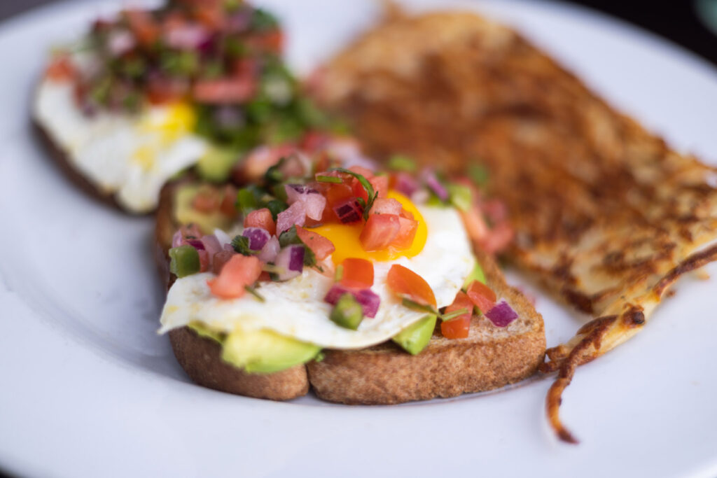 Bartenders craft their own Bloody Mary mix, starting with a base of tomato juice and Zing Zang, enhanced with “I’ll never tell” spices. The sought-after brunch cocktail is garnished with pickle, pepperoncini, pepper jack cheese, and an olive, which Arensberg said pairs perfectly with the Avocado Egg Toast.