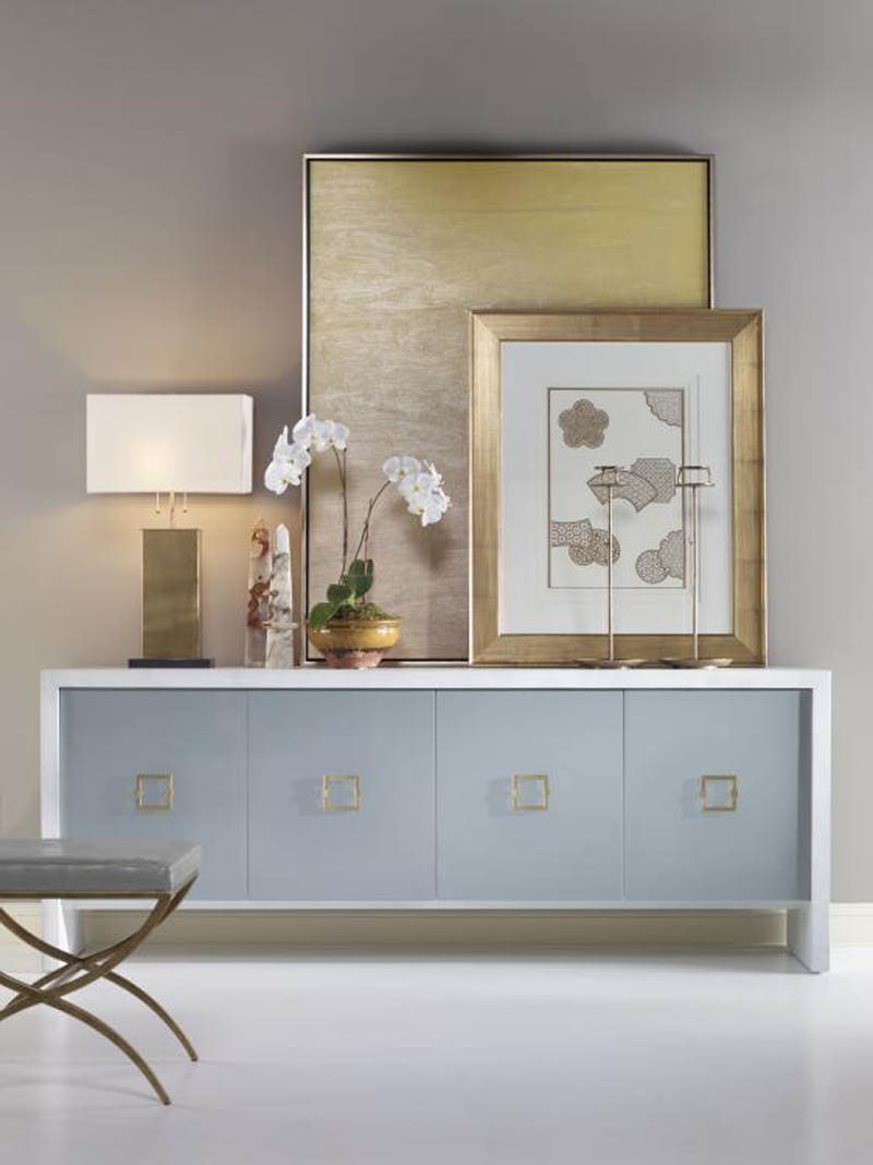 - New materials, such as this console table featuring gray doors that are actually back painted glass set in a cast stone surround with new brass hardware, added interest to pieces. Back painted glass is a trend we’re seeing, and it gives a soft, refreshed look – a new twist on painted or stained finishes, almost a modern eglomoise.