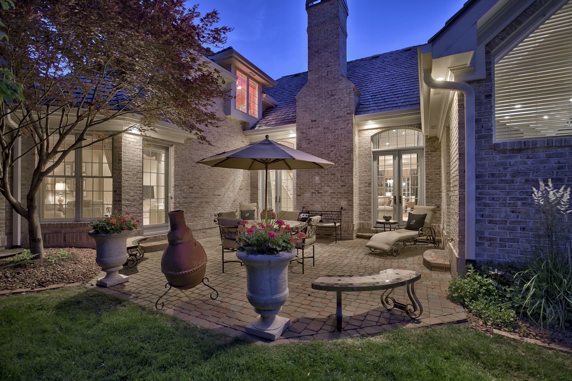 The third requirement for their home was that it include a stone patio rather than a deck. The secluded courtyard surrounded by lush landscaping and a privacy wall in matching brick has been maintenance free for 19 years. And with the way the house is positioned on the double lot, the patio is completely shaded during the warmest times of the day.