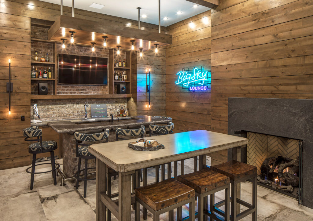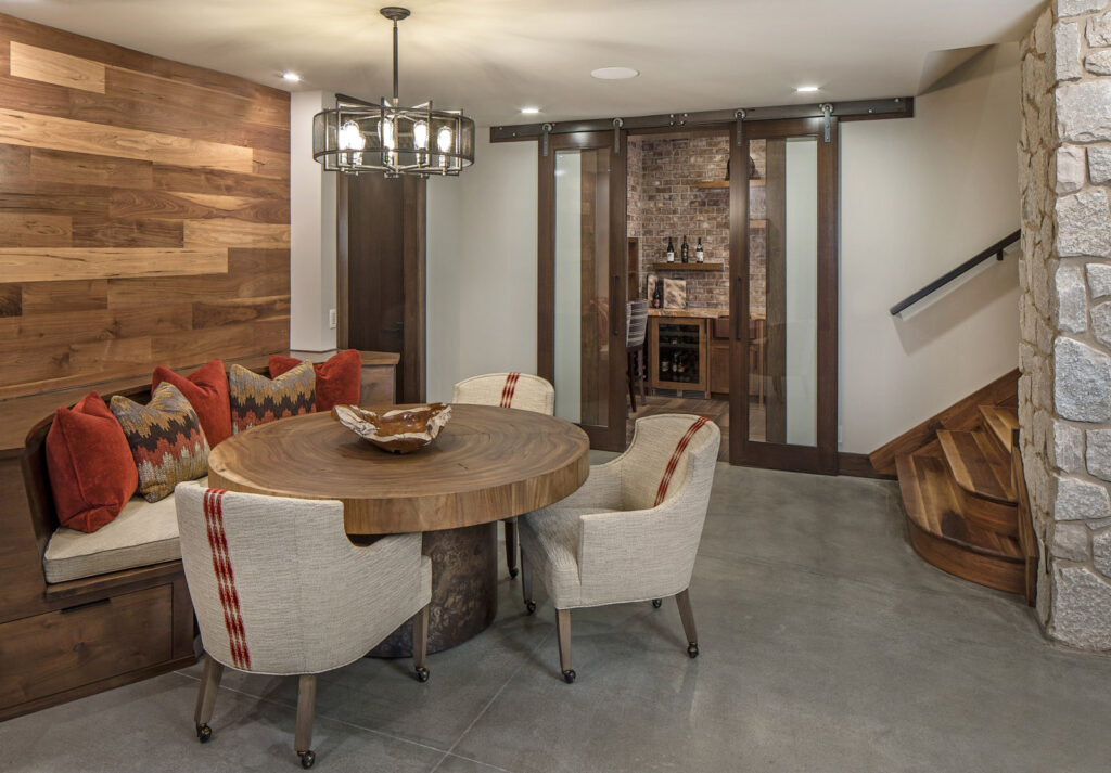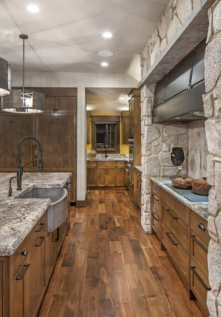 A color palette of earthen tones, with slate grays, harvest golds, and naturals sets the tone for this casual retreat. Although the many textures and natural materials give the design an approachable feeling, the collection of furnishings and overall motif is sophisticated. Natural stone accent is carried throughout the home’s main floor, lending a rustic appeal to the aesthetic. Some of the home’s unique amenities include a large bar and four-seasons room area located off the great room, a wine cellar and tasting room in the lower level, and a spacious kitchen and pantry area.
