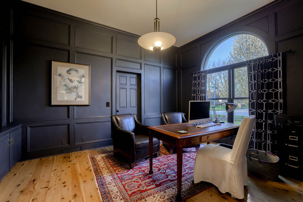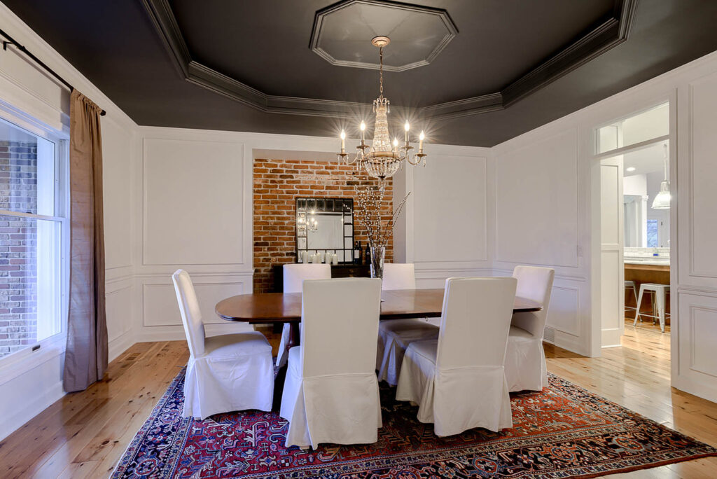 The theme of the five-bedroom, 1.5-story home is simple, according to Nicholas: comfort with an elegant flair. For example, the walls of the study are painted a striking black that contrasts with the white ceiling, giving the space a truly modern touch. In the dining room, the space boasts a crystal chandelier, black painted ceiling, crisp white walls, as well as a single brick wall insert composed of bricks from a historic building in downtown Omaha.