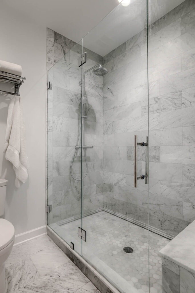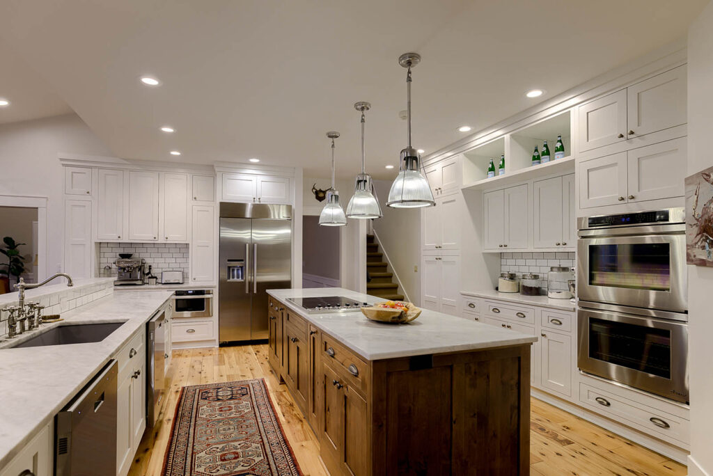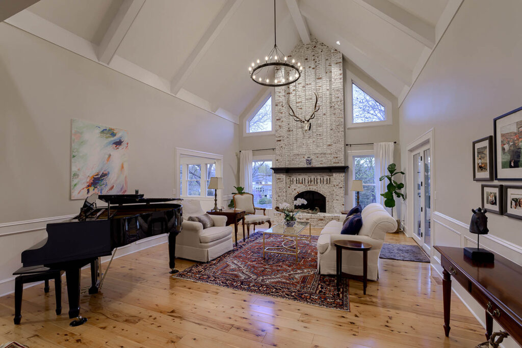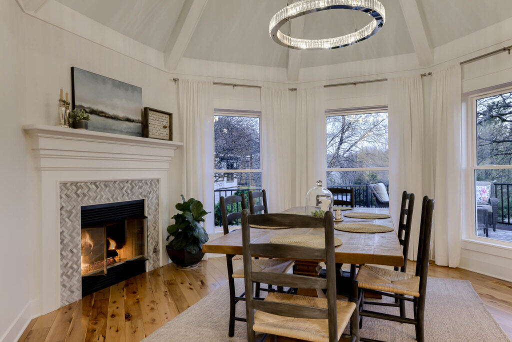 Vaulted ceilings, as well as oversized windows lining the walls, allow the main living area to feel bright and open. The gourmet kitchen, equipped with Carrara marble, antique Russian pendant lights over the island, and top of the line appliances, was completely redesigned to exude a luxurious and crisp essence. To the family’s delight, a deck off of the kitchen overlooks the private backyard, which is often filled with charming wildlife critters like foxes, turkeys, and eagles.
