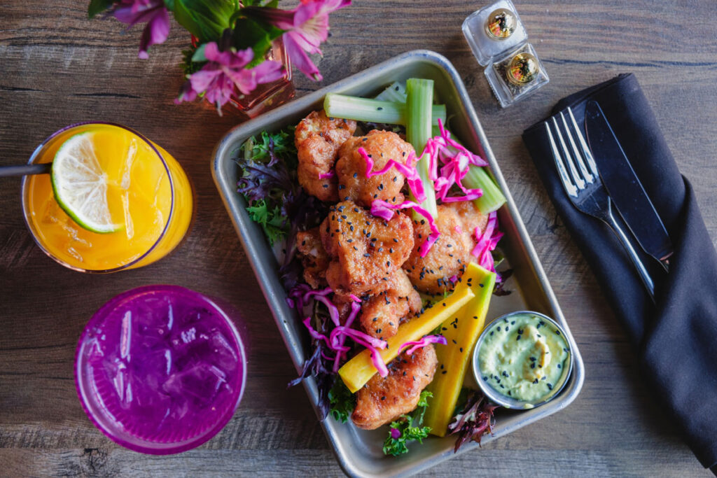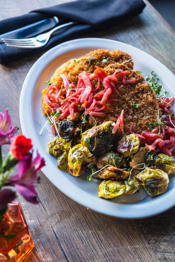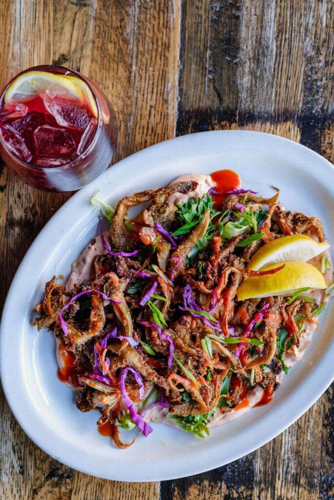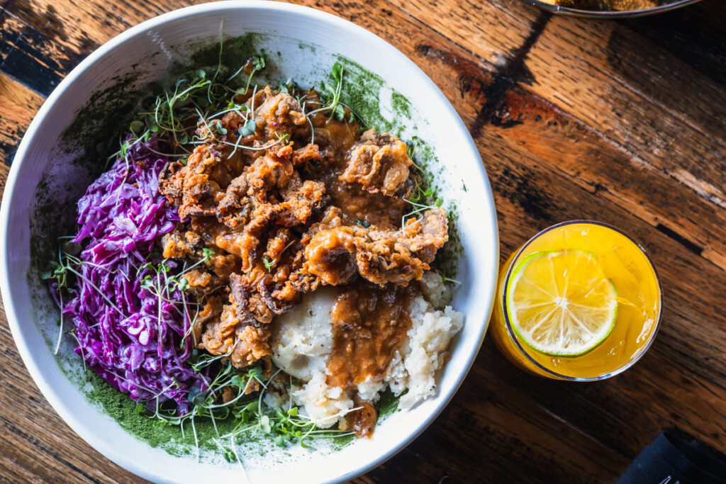 Local oyster mushrooms are battered and fried until they pull apart like actual fried chicken for the most popular Antiestablishmentucky Fried Chicken. Seitan—wheat meat pounded, simmered, and shaped into wings, burgers, pork chops, and meatballs—anchors a menu built on approachable classics like Spaghetti and Beetballs and Not-Your-Mom’s Meatloaf. Add a brown onion gravy with creamy mashed potatoes, coleslaw, and flaky, layered biscuits and butter that are made in-house (coconut oil, olive oil, oat milk, and salt), and you’ll have to check your location to remember you’re not sitting in a deep-fried Southern establishment with all the fixins.