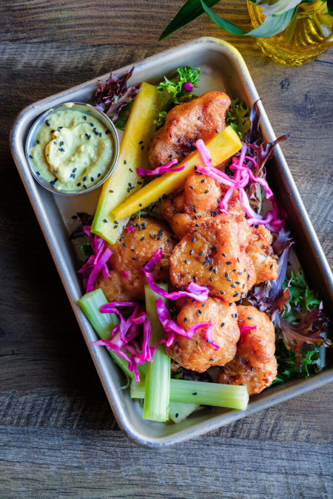 Sichuan Hot Honee Wings—your choice of herb-crusted seitan or crispy cauliflower—are slathered in the unique sauce that is bolstered by Fifth House’s in-house honey. Not a natural vegan product, Smith has perfected his honey creation by cooking down apple juice with chicory root, licorice root, and chamomile. “It literally tastes just like honey,” Smith said. “It’s wild.” Fresh ginger, garlic, and dried chiles give the hot honey sauce its kick.